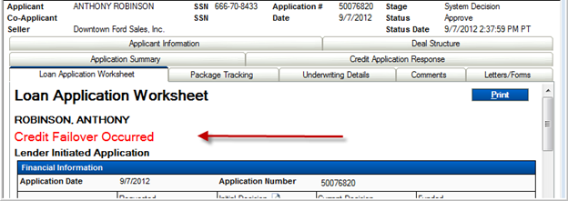 CUDL3 display of “Credit Failover Occurred” alert on the Loan Application Worksheet