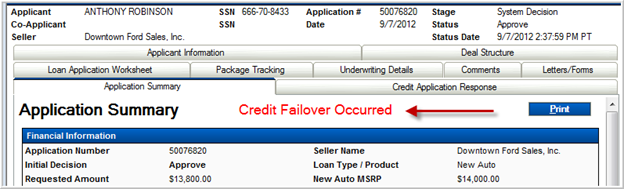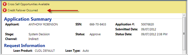 Lending 360 display of “Credit Failover Occurred” alert on the Application Summary