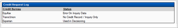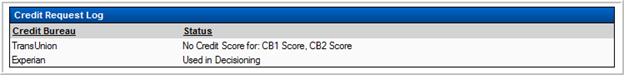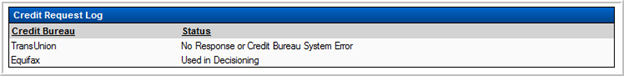 In CUDL3, a new section titled “Credit Request Log” shows the status of each credit bureau inquiry. For each credit bureau, the log identifies the failover reasons or indicates the credit bureau was “Used in Decisioning”. The examples below show the text that will be displayed for each failover reason.