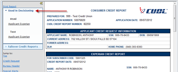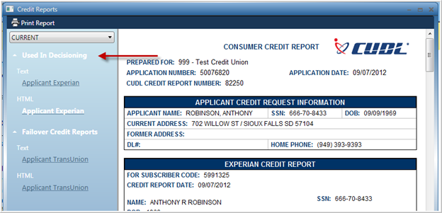 | • | Used in Decisioning: displays the credit reports that were evaluated in the decision process |