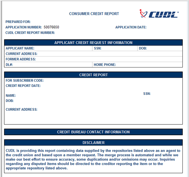 In both CUDL3 and Lending 360, if the credit inquiry results in “no response” from the credit bureau, the credit report form will display with no data.