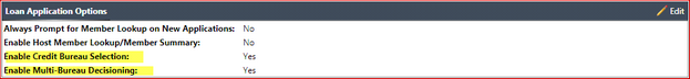 In order to use multi-bureau decisioning or alternate single bureau decisioning, the feature must be enabled in the application entry system (Lending 360 or CUDL4). This is done through Administrative Options > General Settings > Loan Application Options in Lending 360/CUDL4.